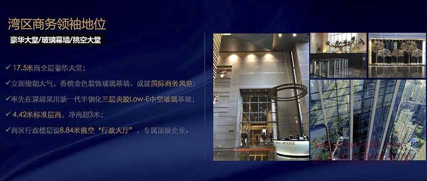 灣區(qū)商務領袖地位:豪華大堂/玻璃幕墻/挑空大堂、17.5米高全層豪華大堂;立面俊朗大氣,香檳金色裝飾玻璃幕墻、成就國際商務風范;率先在深圳采用新一代半鋼化三層夾膠Low-E中空玻璃幕墻;4.42米標準層高,凈高超3米;高區(qū)行政樓層設8.84米挑空“行政大廳”專屬頂級企業(yè)