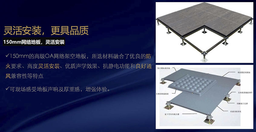 靈活安裝:更具品質、150mm網絡地板,靈活安裝、150mm的高級OA網絡架空地板,所選材料融合了優(yōu)良的防 火要求、高度靈活安裝、優(yōu)質聲學效果、抗靜電功能和良好通 風兼容性等特點、可現場感受地板聲響及厚重感,增強體驗
