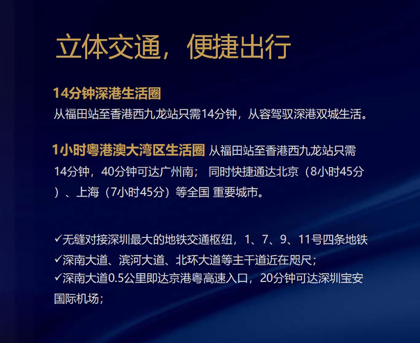 無縫對接深圳最大的地鐵交通樞紐:1、7、9、11號四條地鐵、深南大道、濱河大道、北環(huán)大道等主干道近在咫尺、深南大道0.5公里即達京港粵高速入口、20分鐘可達深圳寶安 國際機場