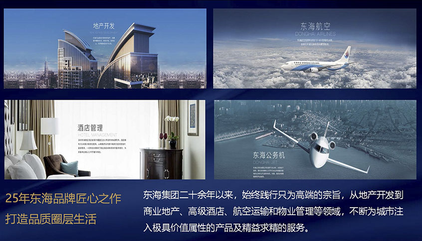25年東海品牌匠心之作、打造品質圈層生活、東海集團二十余年以來,始終踐行只為高端的宗旨,從地產開發(fā)到 商業(yè)地產、高級酒店、航空運輸和物業(yè)管理等領域,不斷為城市注 入極具價值屬性的產品及精益求精的服務
