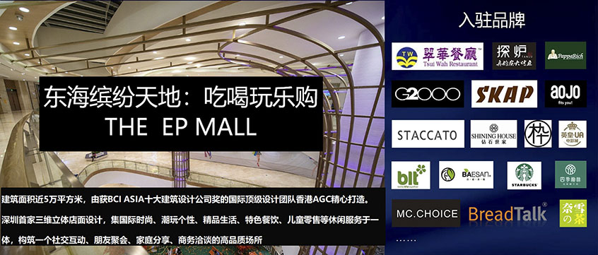 東海繽紛天地:吃喝玩樂購、THE、EP MALL、建筑面積近5萬平方米,由獲BCI ASIA十大建筑設計公司獎的國際頂級設計團隊香港AGC精心打造