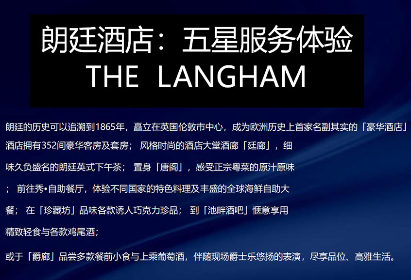 朗廷的歷史可以識溯到1865年,矗立在英國倫敦市中心。成為歐洲歷史上首家名副其實的(豪華酒店)酒店擁有352間豪華客房及套房;風格時尚的酒店大堂酒廊「廷廊」,細味久負盛名的朗廷英式下午茶: 置身【唐閣」,感受正宗粵菜的原汁原味、前往秀?自助餐廳,體驗不同國家的特色料理及豐盛的全球海鮮自助大餐;在[珍藏坊」品味各款誘人巧克力珍品: 到【池畔酒吧」愜意享用精致輕食與各款雞尾酒:或于「爵廊】品嘗多款餐前小食與上乘葡萄酒,伴隨現場廚士樂悠揚的表演,盡事品位、高雅生活