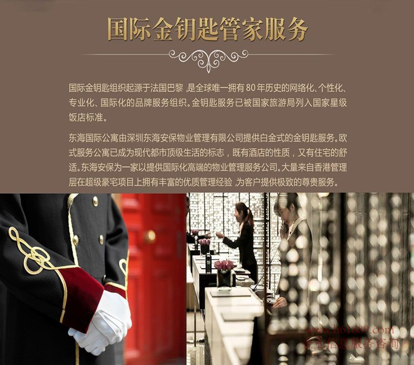 東海國際公寓由深圳東海安保物業(yè)管理有限公司提供白金式的金鑰匙服務。歐式服務公寓已成為現代都市頂級生活的標志,既有酒店的性質,又有住宅的舒適。東海安保為一家以提供國際化高端的物業(yè)管理服務公司。大量來自香港管理層在超級豪宅項目上擁有豐富的優(yōu)質管理經驗為客戶提供極致的尊貴服務
