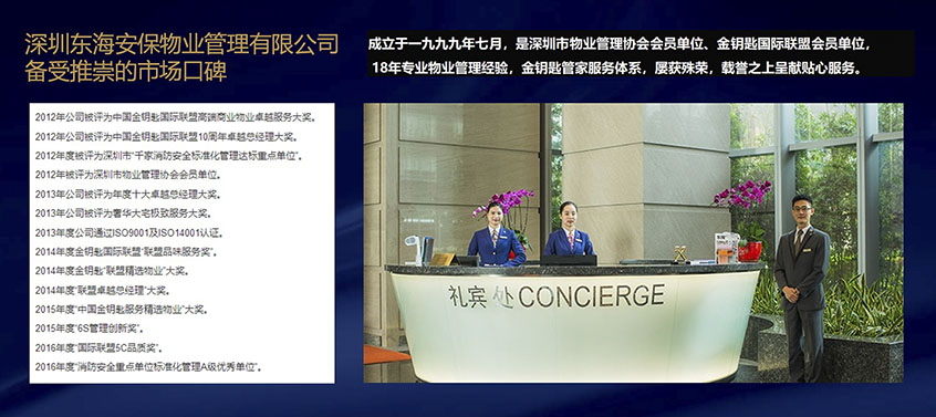 深圳東海安保物業(yè)管理有限公司、成立于一九九九年七月,是深圳市物業(yè)管理協(xié)會會員單位、金鑰匙國際聯盟會員單位,18年專業(yè)物業(yè)管理經驗,金鑰匙管家服務體系,屢獲殊榮,載譽之上呈獻貼心服務