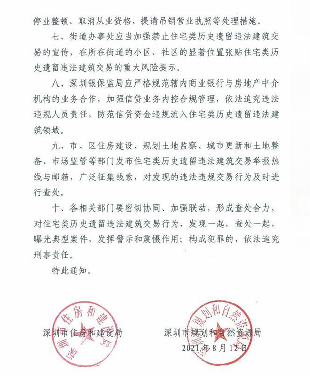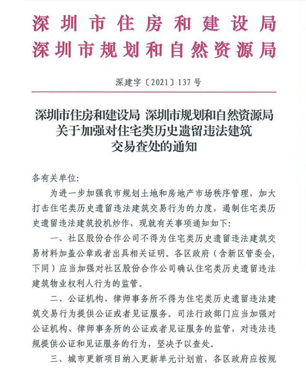 2021年08月19日、一則深圳《關(guān)于加強(qiáng)對住宅類歷史遺留違法建筑交易查處的通知》流出