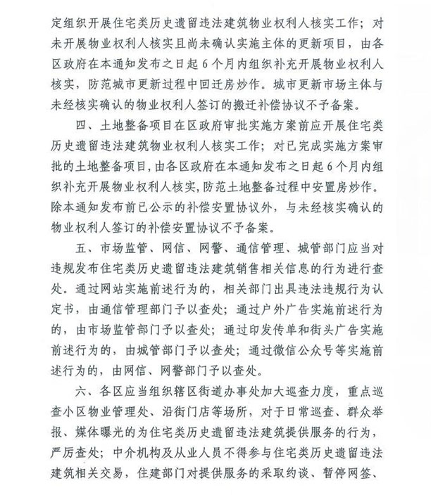 六、各區(qū)應(yīng)當(dāng)組織轄區(qū)街道辦事處加大巡查力度,重點(diǎn)巡查小區(qū)物業(yè)管理處、沿街門店等場所,對于日常巡查、群眾舉報、媒體曝光的為住宅類歷史遺留違法建筑提供服務(wù)的行為,嚴(yán)厲查處;中介機(jī)構(gòu)及從業(yè)人員不得參與住宅類歷史遺留違法建筑相關(guān)交易,住建部門對提供服務(wù)的采取約談、暫停網(wǎng)簽、停業(yè)整頓、取消從業(yè)資格、提請吊銷營業(yè)執(zhí)照等處理措施