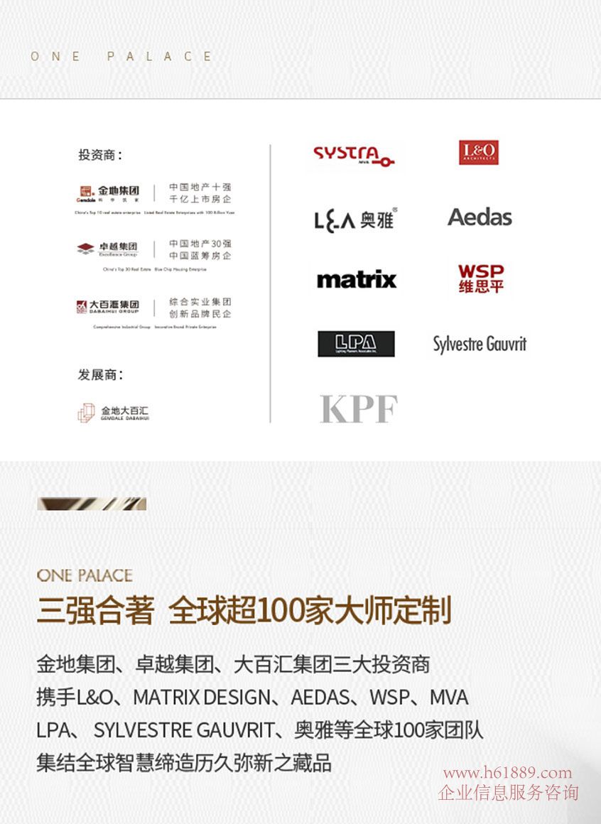深圳中心天元、三強合著、全球超100家大師定制、金地集團、卓越集團、大百匯集團三大投資商、攜手L&O、MATRIXDESIGN、AEDAS、WSP、MVA LPA、SYLVESTREGAUVRIT、奧雅等全球100家團隊集結(jié)全球智慧締造歷久彌新之藏品
