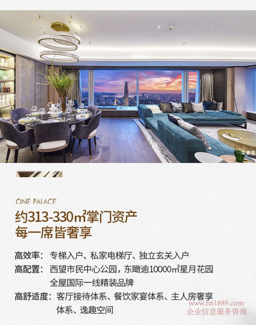 深圳中心天元、約: 93m-141m-196m-238m-266m-313m-330m-383m-393m掌門資產(chǎn)每一席皆奢享、高效率:專梯入戶、私家電梯廳、獨立玄關(guān)入戶、高配置:西望市民中心公園、東瞰逾10000m星月花園、全屋國際一線精裝品牌、高舒適度:客廳接待體系、餐飲家宴體系、主人房奢享體系、逸趣空間