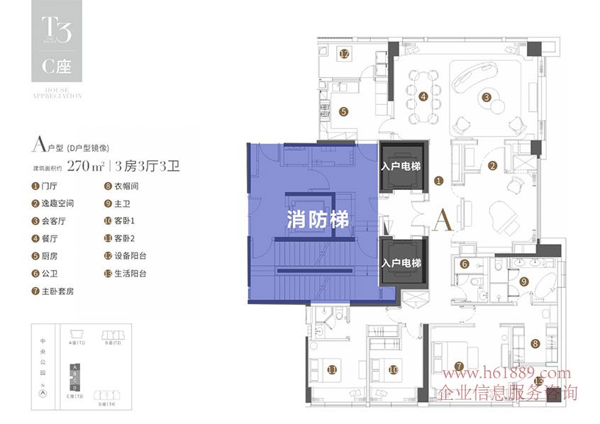 T3棟 C座 A戶型(D戶型鏡像) 建筑面積的:270m、3房3廳3衛(wèi)