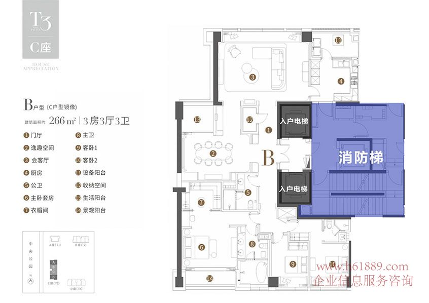 T3棟 C座 B戶型(C戶型鏡像) 建筑面積的:266m、3房3廳3衛(wèi)