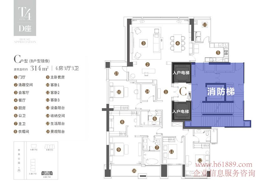 T3棟 D座 C戶型(B戶型鏡像) 建筑面積的:314m、4房3廳3衛(wèi)
