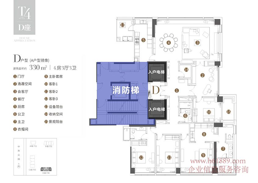 T3棟 D座 D戶型(A戶型鏡像) 建筑面積的:330m、4房3廳3衛(wèi)