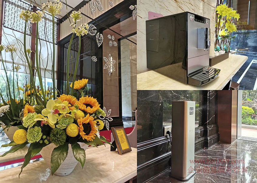 在第二重大堂里、咖啡機(jī)、充電寶、報(bào)刊架等設(shè)施、為業(yè)主等候時(shí)提供便利、香薰機(jī)、加濕器、保證著空間內(nèi)的氣味與濕度、每周換新的鮮花陳設(shè)、與墻壁上裝飾的施華若世奇花瓣、交相輝映,靜品花意、電梯里常見的顯示屏、24小時(shí)播放央視新聞、為業(yè)主提供最新鮮的資訊