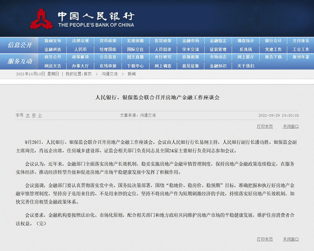 2021年9月29日,人民銀行、銀保監(jiān)會(huì)聯(lián)合召開(kāi)房地產(chǎn)金融工作座談會(huì)。會(huì)議由人民銀行行長(zhǎng)易綱主持,人民銀行副行長(zhǎng)潘功勝、銀保監(jiān)會(huì)副主席周亮、肖遠(yuǎn)企出席,住房城鄉(xiāng)建設(shè)部、證監(jiān)會(huì)相關(guān)部門(mén)負(fù)責(zé)同志及全國(guó)24家主要銀行負(fù)責(zé)同志參加會(huì)議。
