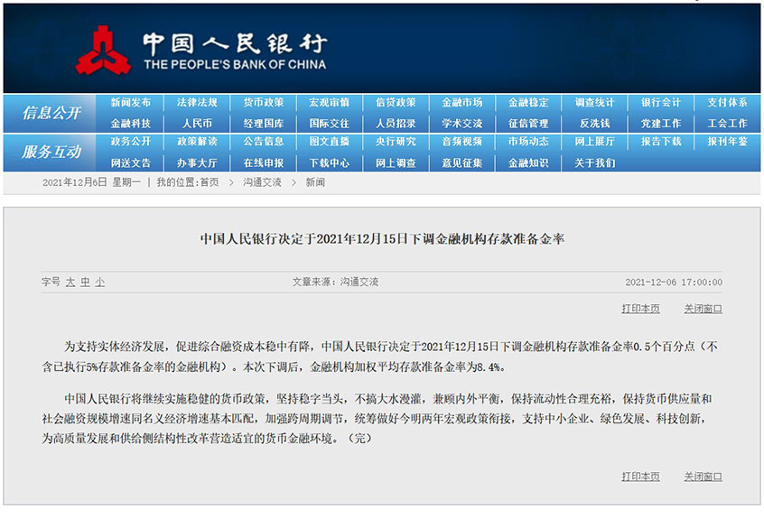 中國人民銀行決定于2021年12月15日下調(diào)金融機(jī)構(gòu)存款準(zhǔn)備金率