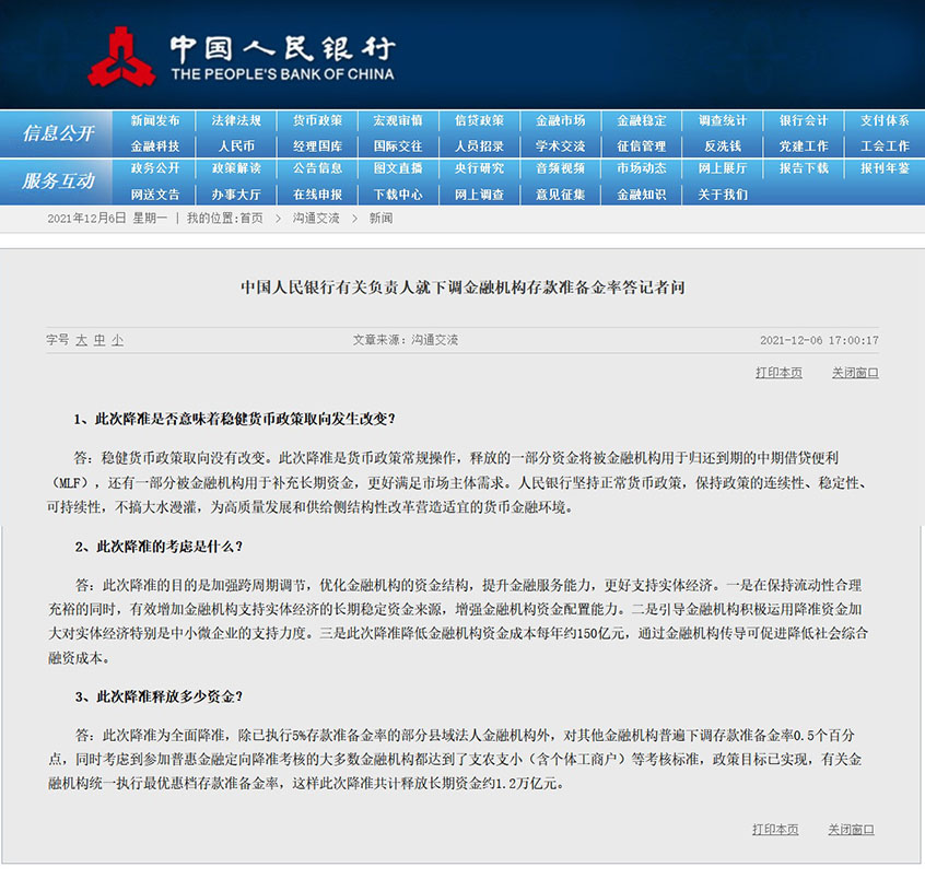 中國人民銀行決定于2021年12月15日下調(diào)金融機(jī)構(gòu)存款準(zhǔn)備金率附解讀