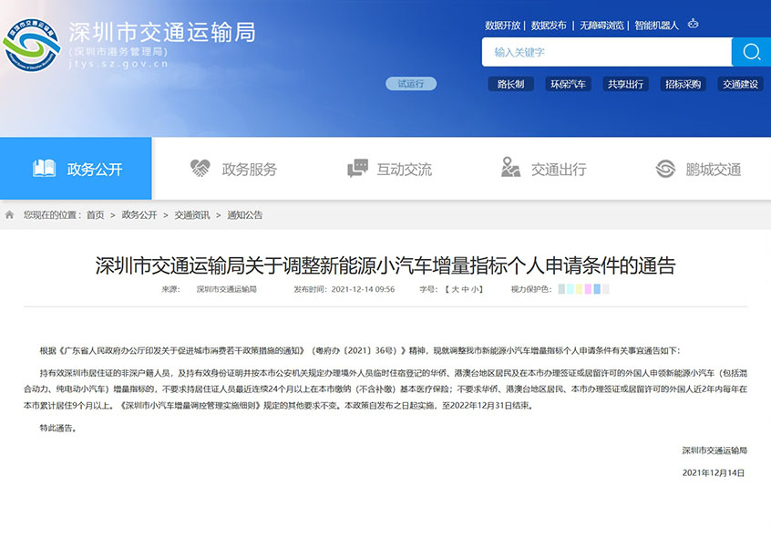 深圳市交通運(yùn)輸局關(guān)于調(diào)整新能源小汽車增量指標(biāo)個(gè)人申請(qǐng)條件的通告