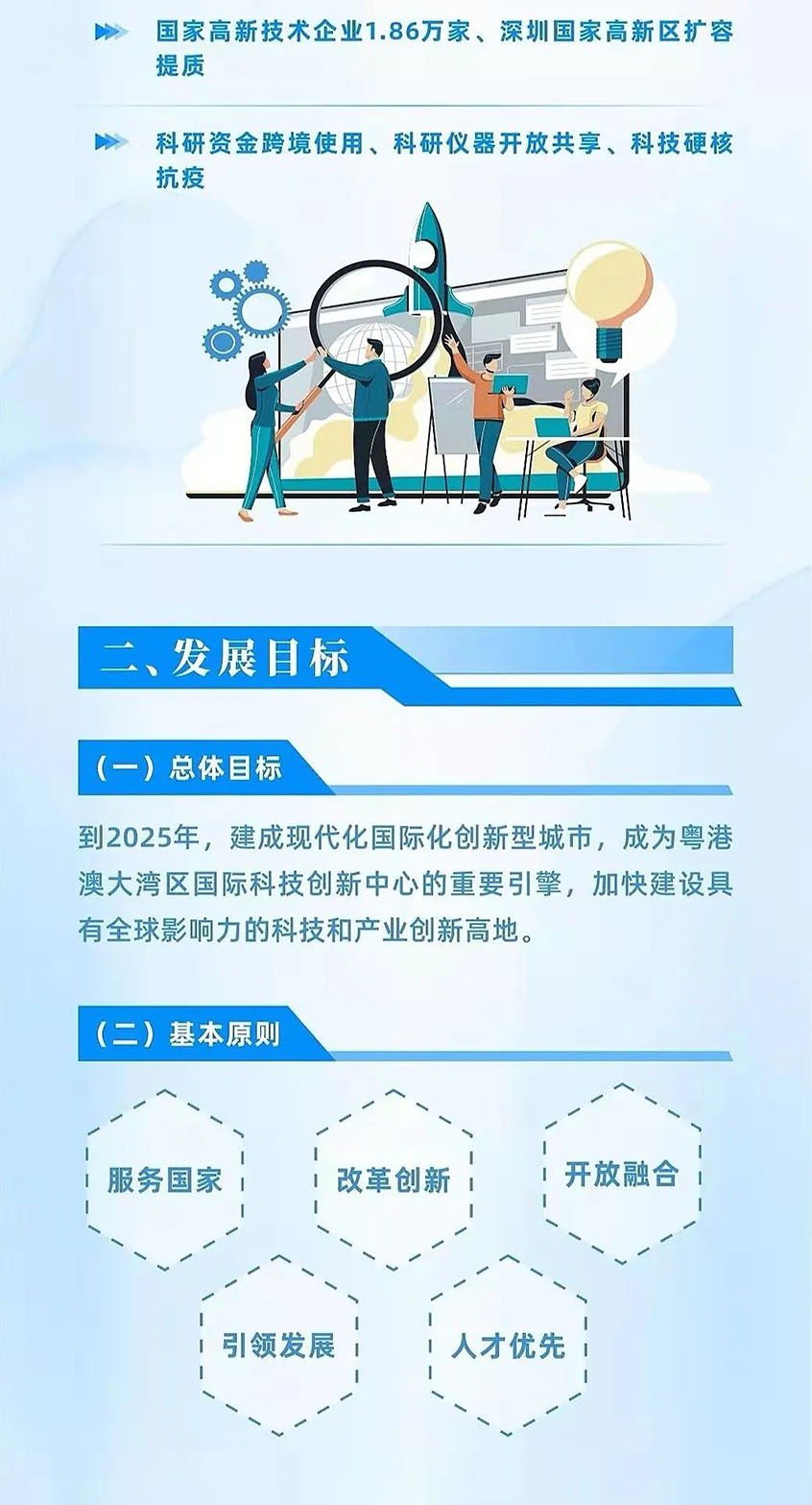 《規(guī)劃》提出發(fā)展目標(biāo):到2025年,深圳將建成現(xiàn)代化國際化創(chuàng)新型城市,成為粵港澳大灣區(qū)國際科技創(chuàng)新中心的重要引擎,加快建設(shè)具有全球影響力的科技和產(chǎn)業(yè)創(chuàng)新高地。