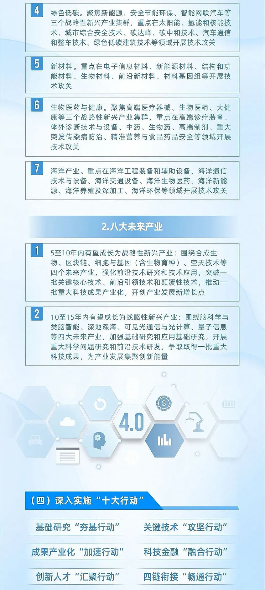 實(shí)施“十大行動”:包括基礎(chǔ)研究"夯基行動"、關(guān)鍵技術(shù)"攻堅(jiān)行動"、成果產(chǎn)業(yè)化"加速行動"、科技金融"融合行動"、創(chuàng)新人才"匯聚行動"、四鏈銜接"暢通行動、開放創(chuàng)新"拓展行動"、科學(xué)文化"厚植行動"、改革創(chuàng)新"深化行動"、法治建設(shè)"保障行動"