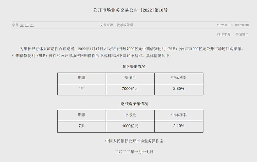 2022年1月17日,央行公告稱,為維護銀行體系流動性合理充裕,今日開展1年期中期借貸便利(MLF)操作7000億元和7天期逆回購操作1000億元,中標利率分別為2.85%和2.1%,均較上一期下降10個BP。