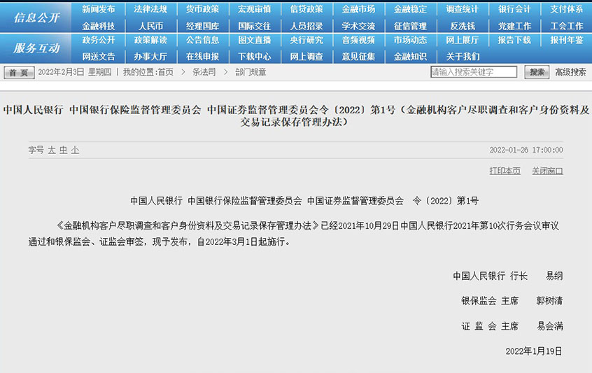 《金融機(jī)構(gòu)客戶(hù)盡職調(diào)查和客戶(hù)身份資料及交易記錄保存管理辦法》已經(jīng)2021年10月29日中國(guó)人民銀行2021年第10次行務(wù)會(huì)議審議通過(guò)和銀保監(jiān)會(huì)、證監(jiān)會(huì)審簽,現(xiàn)予發(fā)布,自2022年3月1日起施行。