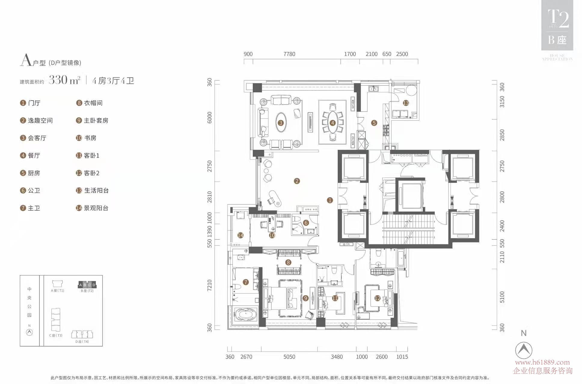 臥室全南向?舒適主臥套間:330㎡4房3廳4衛(wèi)
