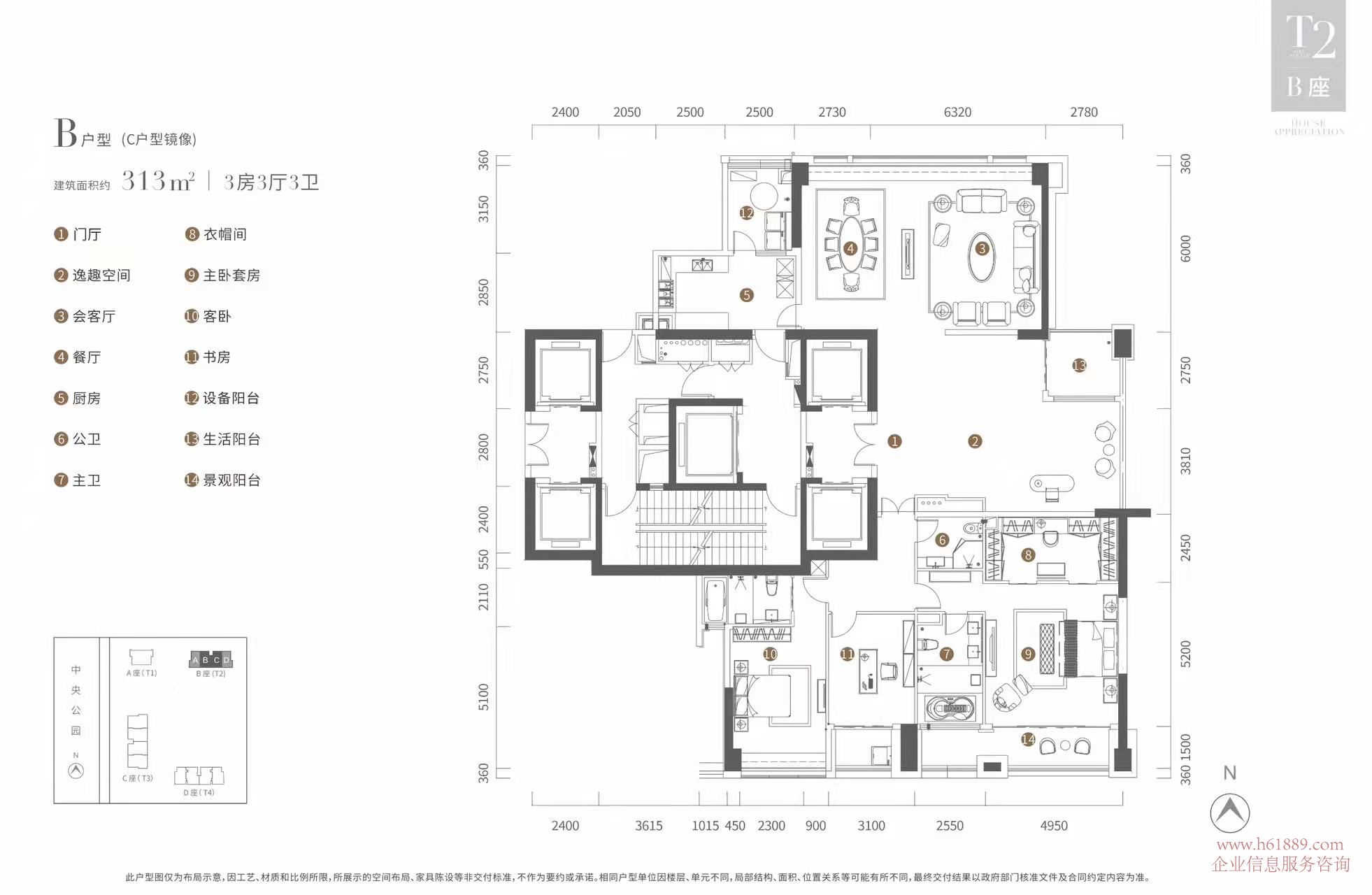 臥室全南向?舒適主臥套間:313㎡3房3廳3衛(wèi)