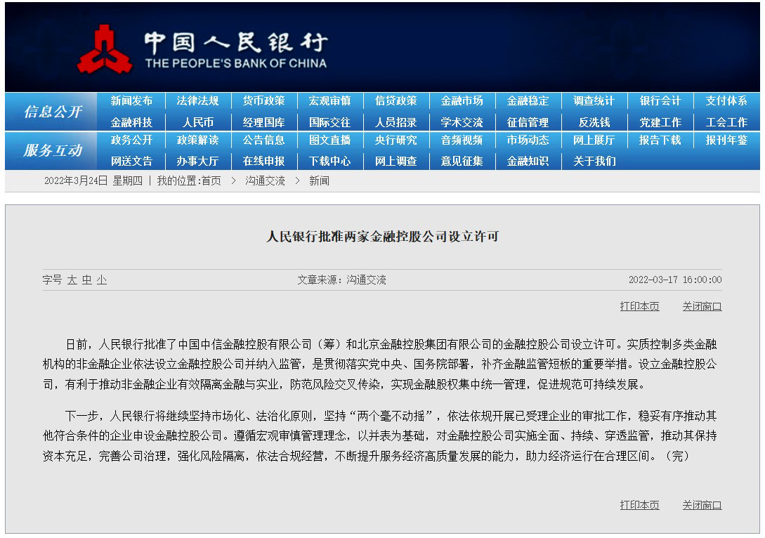 2022年3月17日,中國人民銀行宣布,已于日前批準(zhǔn)了中國中信金融控股有限公司(籌)和北京金融控股集團(tuán)有限公司的金融控股公司設(shè)立許可。這標(biāo)志著我國設(shè)立金融控股公司邁出實(shí)質(zhì)性一步,金融控股公司正式迎來持牌經(jīng)營新階段。未來一段時(shí)間,將有更多的金融控股公司設(shè)立申請被受理和批準(zhǔn)。應(yīng)進(jìn)一步細(xì)化相關(guān)制度辦法,提升金融控股公司監(jiān)管效能,規(guī)范金融秩序、防范金融風(fēng)險(xiǎn),推動金融控股公司更好地服務(wù)實(shí)體經(jīng)濟(jì)。