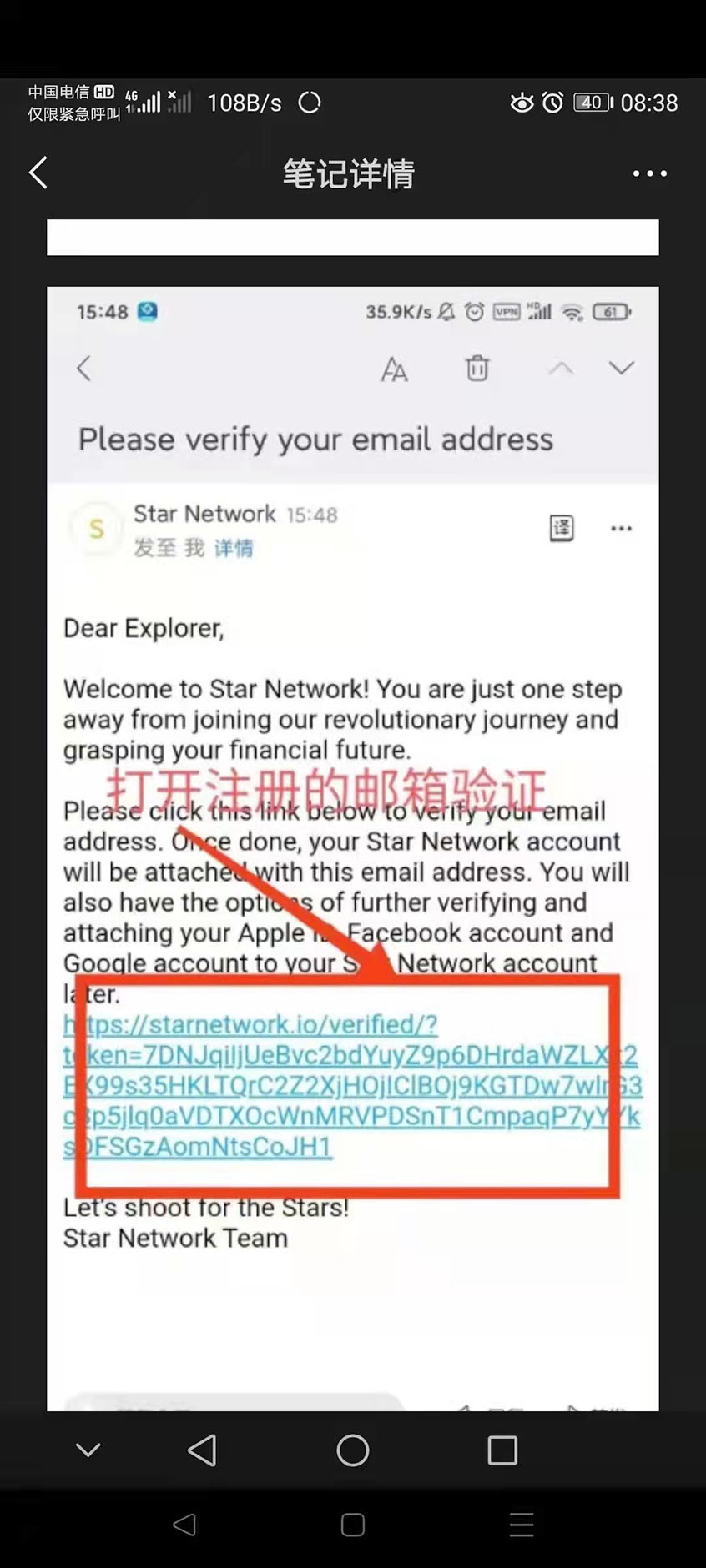 第六步:登陸電子郵箱、找到并打開(kāi) Star Network 星網(wǎng) 星幣 發(fā)來(lái)的郵件、點(diǎn)擊郵件中間位置的鏈接