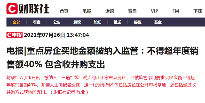2021年7月26日,被納入“三道紅線”試點的幾十家重點房企被監(jiān)管部門要求買地金額不得超年度銷售額40%,不僅包括房企在公開市場拿地,還包括通過收并購方式獲地的支出。這些政策通過影響單個房企的融資增速,影響房企拿地、投資、銷售,降低購買者對樓市的信心