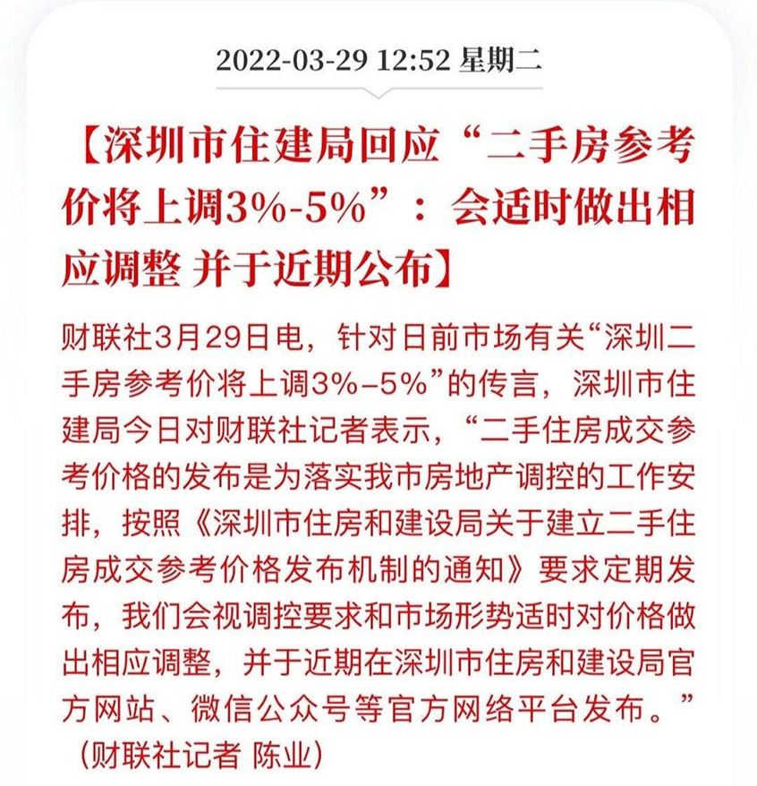 近日網(wǎng)上一直在傳深圳二手房指導價將上調(diào)3%-5%消息,但此前并沒有官方出來說明。3月29日,深圳市住建局對相關(guān)媒體表示,二手住房成交參考價格的發(fā)布是為落實深圳房地產(chǎn)調(diào)控的工作安排,按照《深圳市住房和建設(shè)局關(guān)于建立二手住房成交參考價格發(fā)布機制的通知》要求定期發(fā)布,官方將會視調(diào)控要求和市場形勢適時對價格做出相應調(diào)整,并于近期在深圳市住房和建設(shè)局官方網(wǎng)站、微信公眾號等官方網(wǎng)絡(luò)平臺發(fā)布