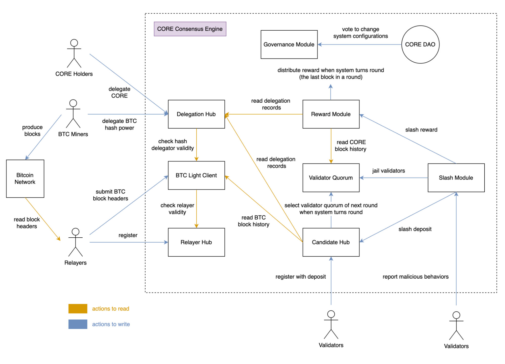 Core是Geth代碼庫的進(jìn)化。我們利用BSC團(tuán)隊(duì)所做的改進(jìn),通過硬分叉增加了更高的吞吐量和更便宜的交易。然而,我們?cè)诤芏喾矫媾cBSC不同。一個(gè)突出的區(qū)別是,核心基于Satoshi Plus共識(shí),它依賴于工作證明(PoW)和委托利益證明(DPoS)。通過這些修改,我們能夠保持分散,而不會(huì)出現(xiàn)傳統(tǒng)PoW共識(shí)系統(tǒng)中的性能權(quán)衡。此外,我們基于委托比特幣哈希能力和委托股份的混合評(píng)分,我們?yōu)轵?yàn)證者和獎(jiǎng)勵(lì)創(chuàng)造了一個(gè)流動(dòng)的市場(chǎng),任何人都可以參與。