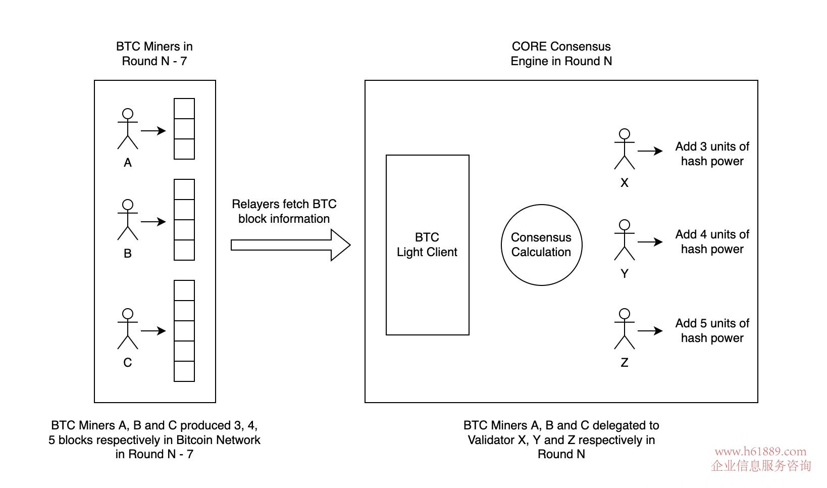 BTC礦工使用公鑰和私鑰, BTC礦工可以將其哈希權(quán)委托給核心驗(yàn)證器,或者如果他們選擇通過在BTC和核心區(qū)塊鏈上驗(yàn)證和同步其身份(地址)來運(yùn)行驗(yàn)證器,則將其哈希權(quán)委托給自己。當(dāng)中繼器提交事務(wù)時(shí),它們會(huì)將BTC礦工挖掘的塊與核心網(wǎng)同步。每一輪,核心網(wǎng)通過計(jì)算BTC網(wǎng)絡(luò)中每個(gè)礦工在前一周的同一天產(chǎn)生的塊數(shù),計(jì)算與每個(gè)驗(yàn)證器關(guān)聯(lián)的BTC哈希功率。映射鏈通信的體系結(jié)構(gòu)如下圖所示。