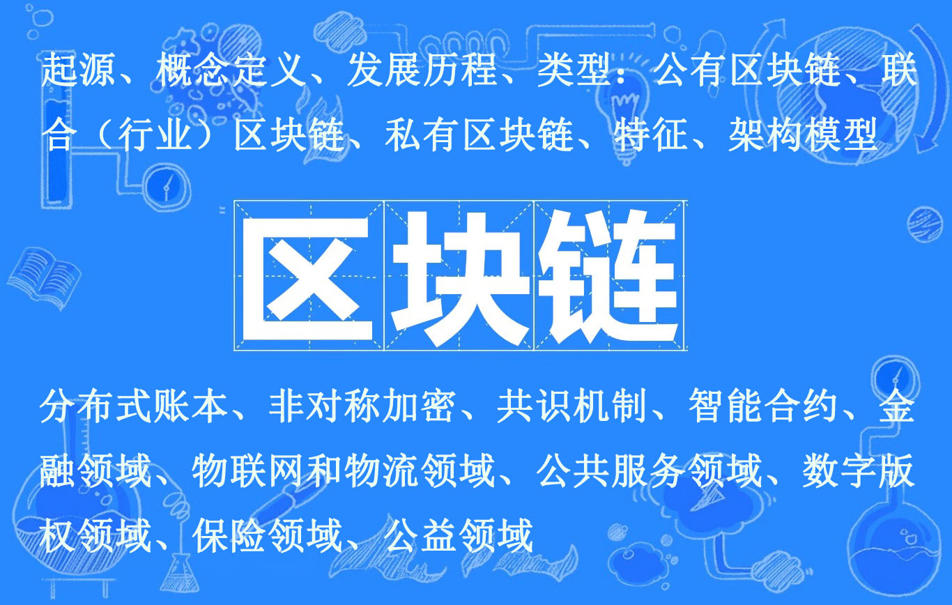 區(qū)塊鏈、起源、概念定義、發(fā)展歷程、公有區(qū)塊鏈、聯(lián)合(行業(yè))區(qū)塊鏈、私有區(qū)塊鏈、特征、架構(gòu)模型、分布式賬本、非對稱加密、共識機制、智能合約、金融領域、物聯(lián)網(wǎng)和物流領域、公共服務領域、數(shù)字版權(quán)領域、保險領域、公益領域