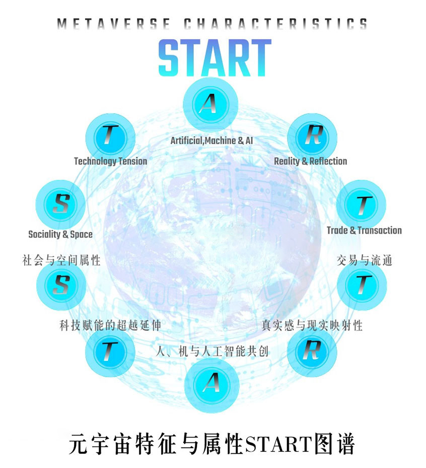 在元宇宙特征與屬性的START圖譜中,北京大學(xué)陳剛教授與董浩宇博士梳理并系統(tǒng)界定了元宇宙的五大特征與屬性,即:社會與空間屬性(Social & Space)、科技賦能的超越延伸(Technology Tension)、人、機(jī)與人工智能共創(chuàng)(ArtifIcal, Machine & AI)、真實(shí)感與現(xiàn)實(shí)映射性(Reality & Reflection)、交易與流通(Trade & Transaction)。