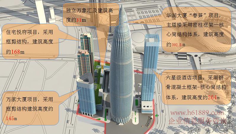 華潤總部大廈、總建筑面積77萬㎡占地8.57萬㎡、由392.5m華潤總部大廈、264m六星級酒店、145m萬家總部大廈、2棟168m悅府住宅、以及31m獨(dú)立萬象匯綜合商場組成、總投資200億元、是集商業(yè)辦公、酒店住宅、觀光娛樂、會議中心、交易中心、餐飲等為一體的大型綜合體建筑群、建成后將是深圳最大的商業(yè)綜合體