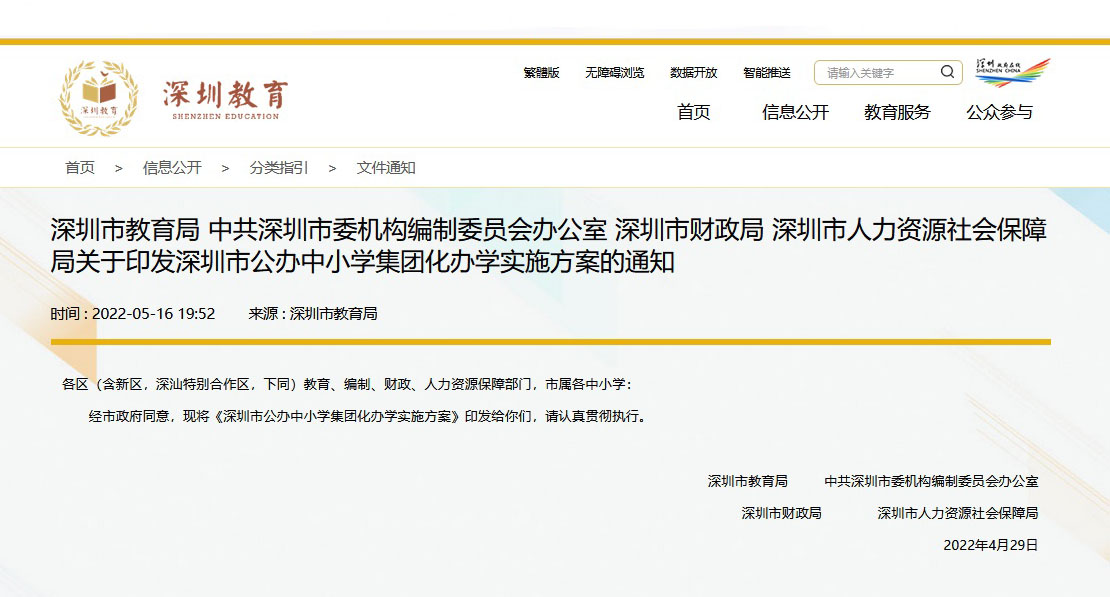 2022年5月16日,《深圳市公辦中小學(xué)集團(tuán)化辦學(xué)實施方案》(以下簡稱《方案》)發(fā)布,《方案》明確,至2025年,深圳將培育80個公辦中小學(xué)教育集團(tuán),集團(tuán)化辦學(xué)覆蓋全市所有新建義務(wù)教育學(xué)校