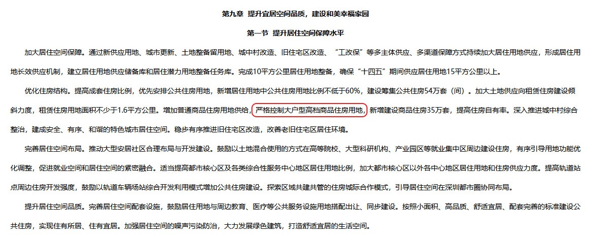 4月25日,《深圳市國土空間規(guī)劃保護(hù)與發(fā)展“十四五”規(guī)劃》(以下簡稱《規(guī)劃》)正式發(fā)布?!兑?guī)劃》透露:要增加普通商品住房用地供給,嚴(yán)格控制大戶型高檔商品住房用地