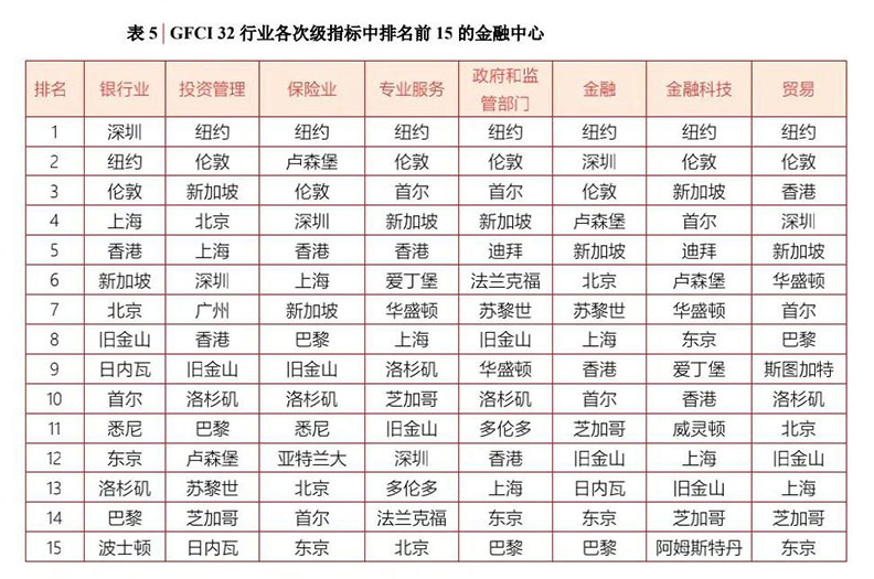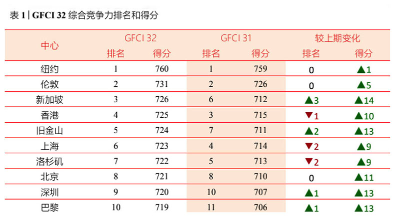 全球金融中心指數(shù)分別于每年 3 月和 9 月更新一次,受到全球金融界的廣泛關(guān)注。該指數(shù)為政策研究和投資決策提供了寶貴的參考依據(jù)。 第32期GFCI共有119個(gè)金融中心進(jìn)入榜單,全球前十大金融中心排名依次為:紐約、倫敦、新加坡、香港、舊金山、上海、洛杉磯、北京、深圳、巴黎