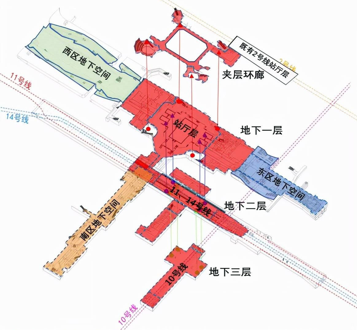 崗廈北樞紐三層設(shè)計(jì)的建成,實(shí)現(xiàn)地鐵2/8號線,10號線站臺在地下三層,11號線和14號線站臺設(shè)在地下二層,地下一層是站廳換乘層