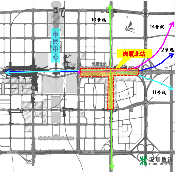 “深圳之眼”崗廈北樞紐、地鐵 2/8、10、11、14號線換乘的綜合樞紐 4線交會直達(dá)6區(qū)
