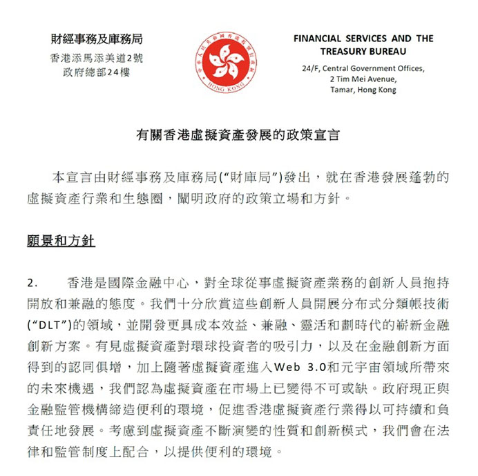 香港:《有關(guān)香港虛擬資產(chǎn)發(fā)展的政策宣言》