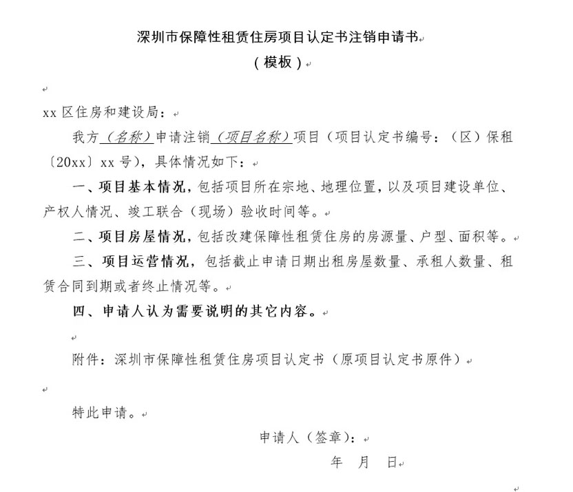 深圳市保障性租賃住房項(xiàng)目認(rèn)定書注銷申請書