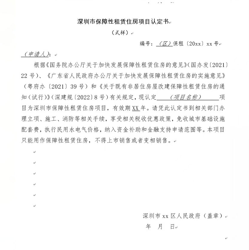 深圳市保障性租賃住房項(xiàng)目認(rèn)定書
