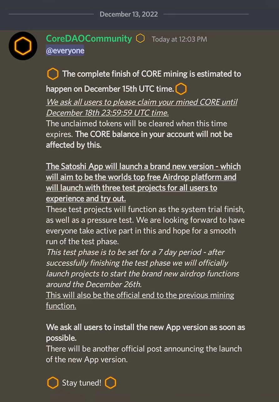 2022年12月13日下午、Discord官方聊天室和CORE挖礦APP發(fā)出公告