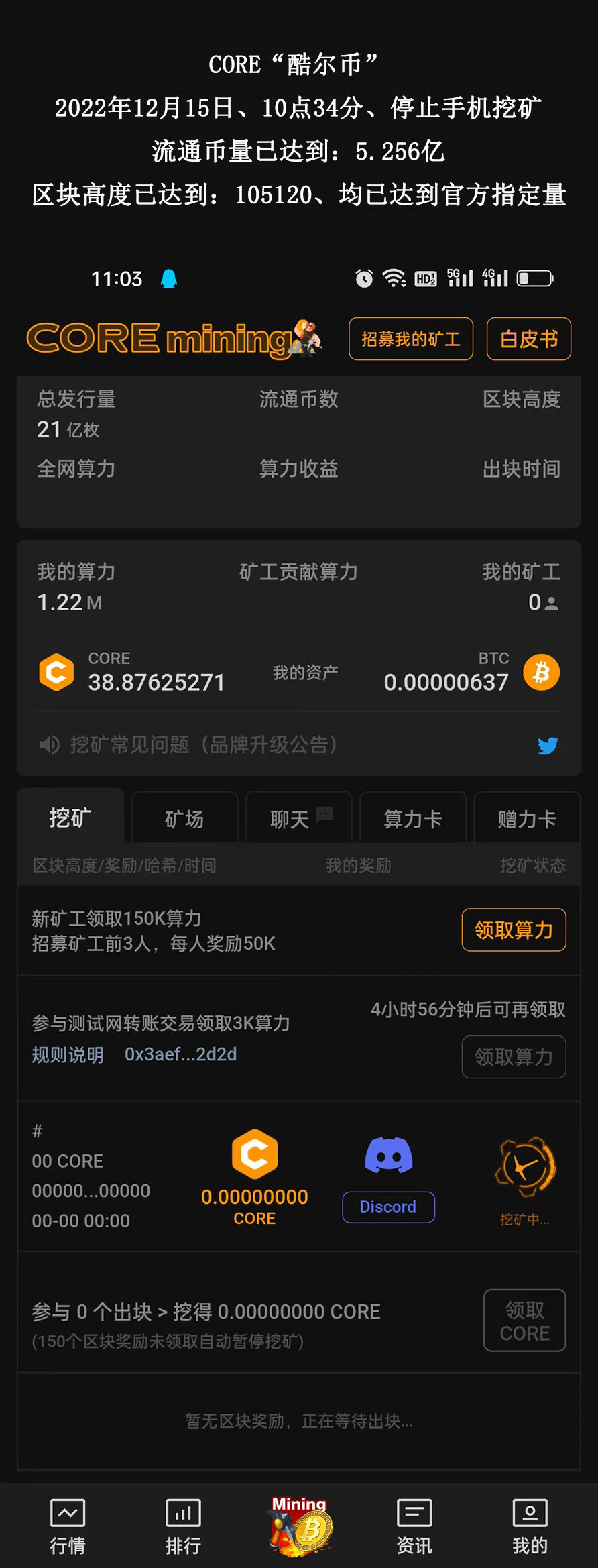 CORE“酷爾幣”2022年10月15日、10點(diǎn)34分、停止手機(jī)挖礦