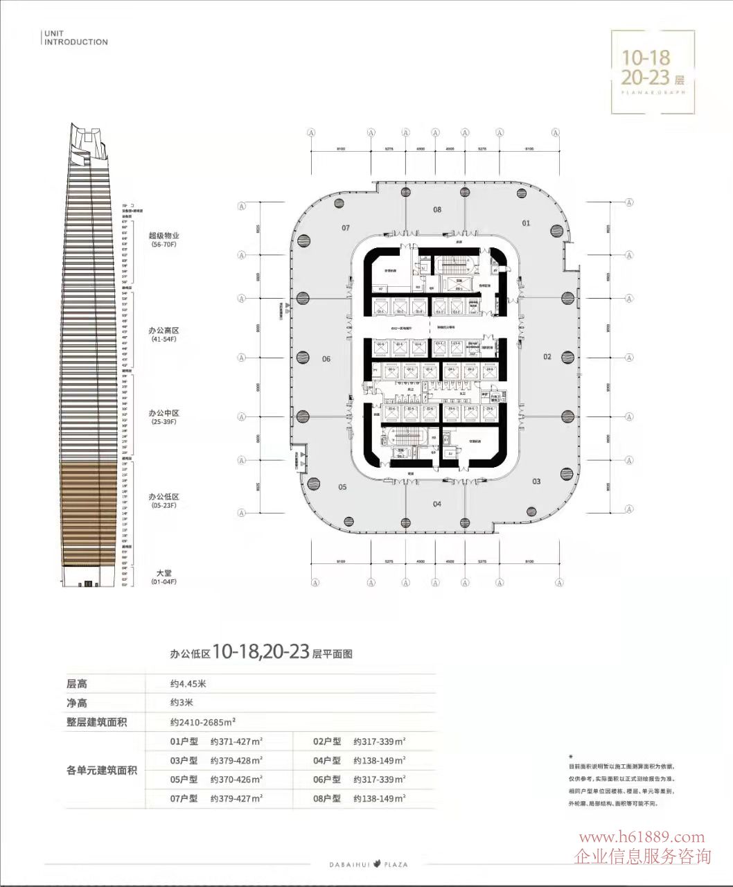 私募證券大廈【原大百匯廣場】:辦公低區(qū) 10到18層、20到23層平面圖、層高約:4.45米、凈高約3米、整層建筑面積約:2410平米到2685平米、各單元建筑面積: