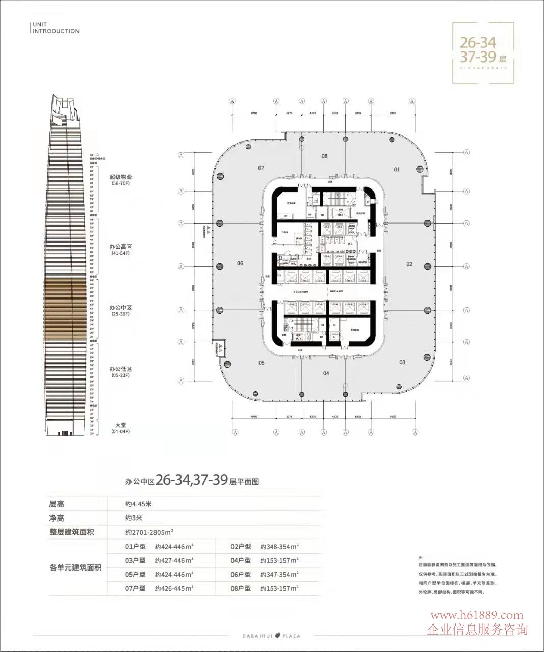私募證券大廈【原大百匯廣場】:辦公中區(qū) 26到34層、37到39層平面圖、層高約:4.45米、凈高約3米、整層建筑面積約:2701平米到2805平米、各單元建筑面積: