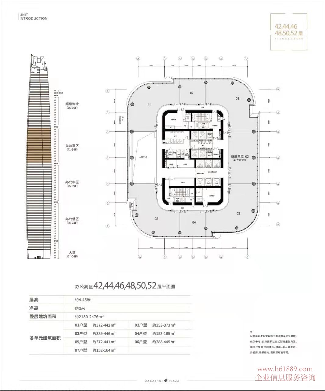 私募證券大廈【原大百匯廣場】:辦公高區(qū) 42層、44層、46層、48層、50層、52層平面圖、層高約:4.45米、凈高約3米、整層建筑面積約:2180平米到2476平米、各單元建筑面積:
