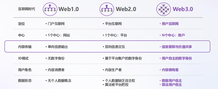 通過Web1可以進行內(nèi)容消費和簡單交互。智能手機和移動互聯(lián)網(wǎng)接入飛速發(fā)展、這在一定程度上促進了Web2的形成、Web2讓用戶能夠消費和創(chuàng)造他們自己的內(nèi)容?,F(xiàn)在、大家熟知的未來網(wǎng)絡Web3的新概念已經(jīng)出現(xiàn)?;ヂ?lián)網(wǎng)的這次新迭代、不僅有望允許用戶消費和創(chuàng)建內(nèi)容和數(shù)據(jù)、而且還有望讓他們擁有內(nèi)容和數(shù)據(jù)